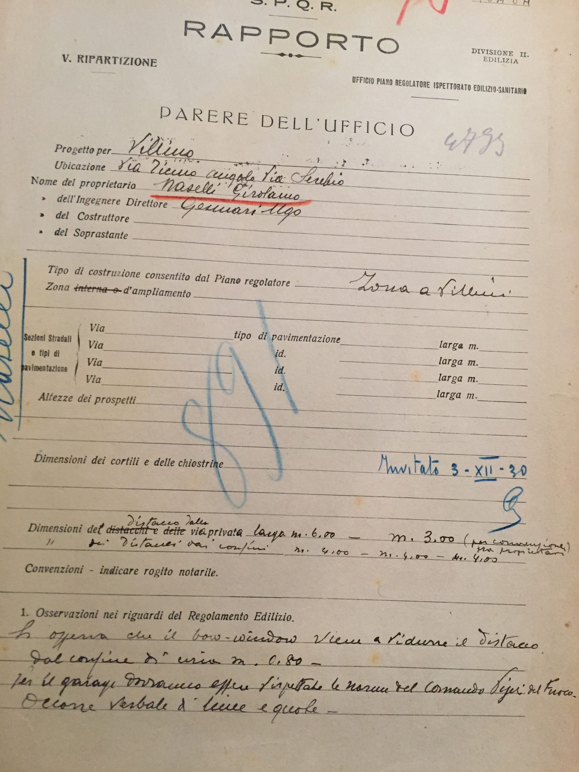 Come avevo suggerito infatti, una semplice visita all’Archivio Storico Capitolino, ha consentito di estrarre e fotografare il progetto originario, elaborato nel 1930 dall’ing. Ugo Gennari per conto del conte Gerolamo Naselli e terminato di costruire nel 1931. Successivamente, l’edificio è passato alla Congregazione delle suore “Ancelle Concezioniste del Divin Cuore” ed ha subito una sopraelevazione negli anni ’50. Questa modifica, pur alterandolo, non ha snaturato l’immobile originario, né ha danneggiato l’adiacente Villino Gigli.